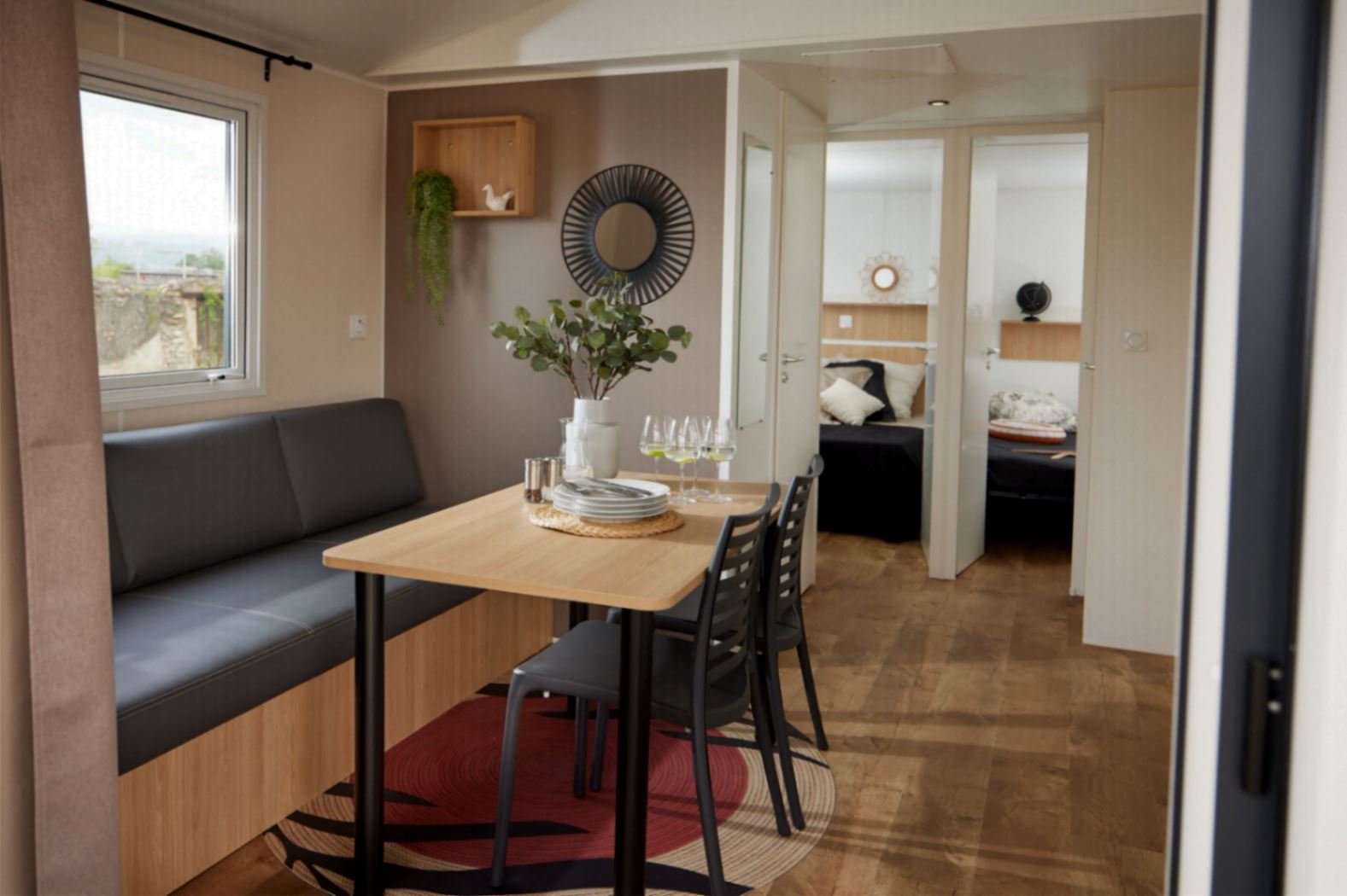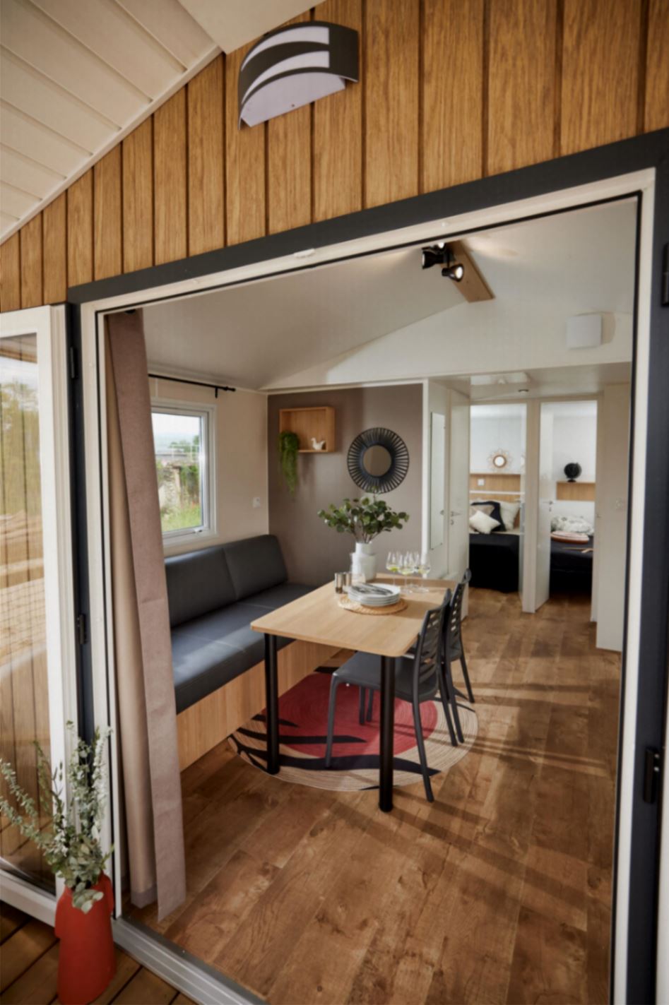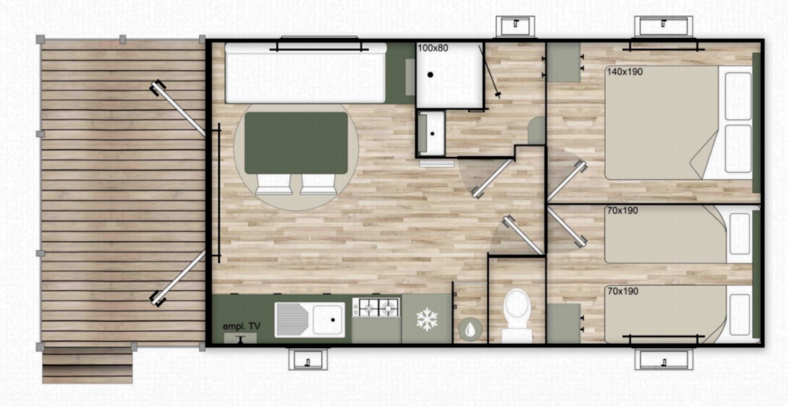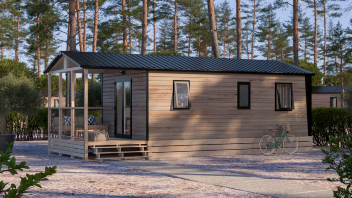 Mobil-Home LAURIER de 32m2 avec terrasse couverte. Parking à côté du mobil-home prévu pour 1 véhicule.