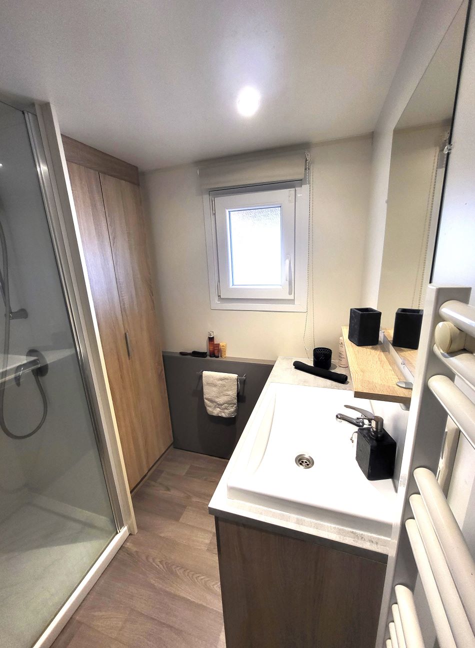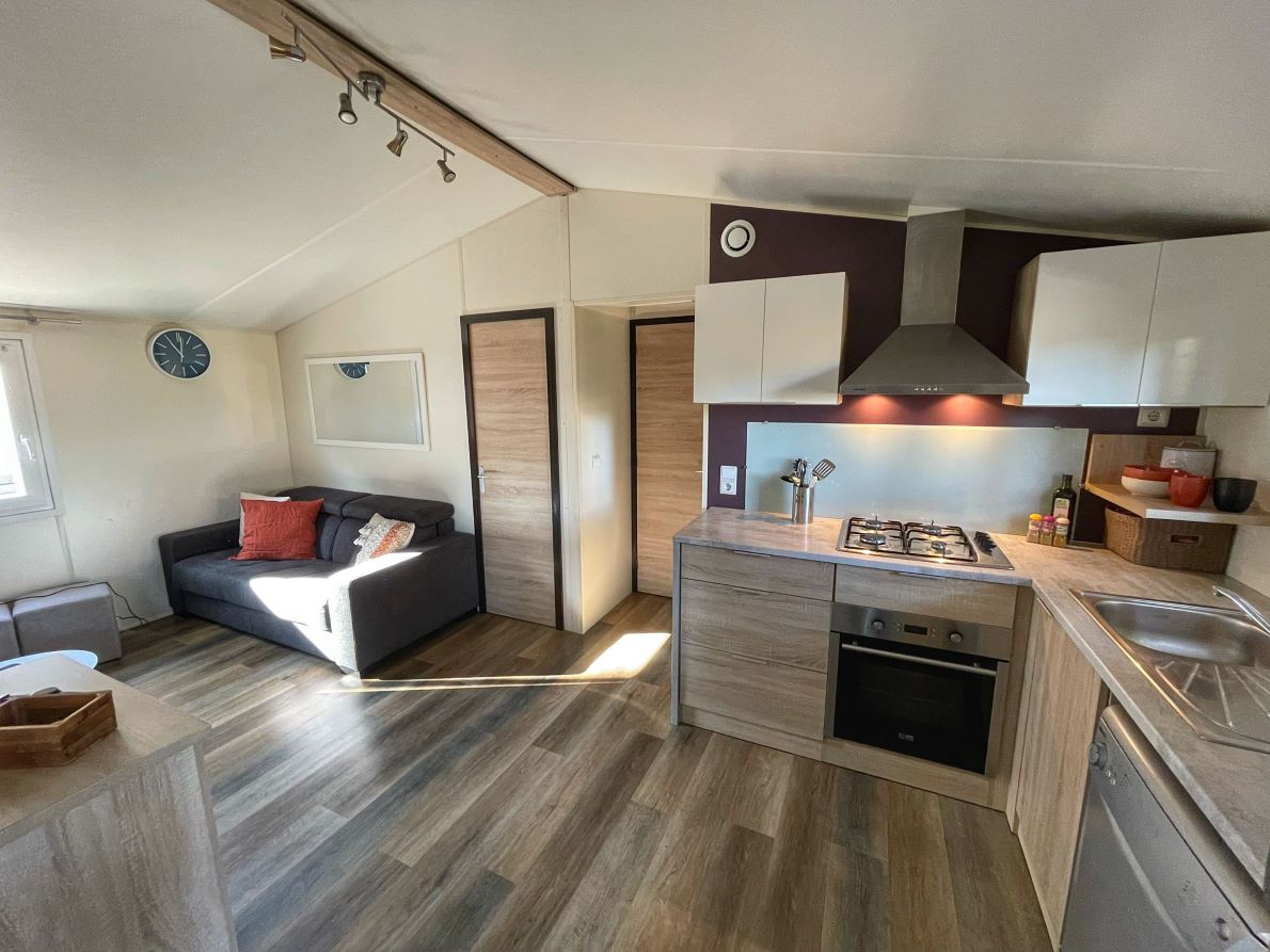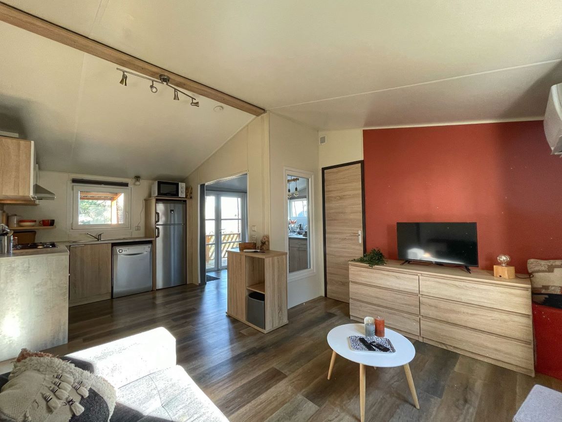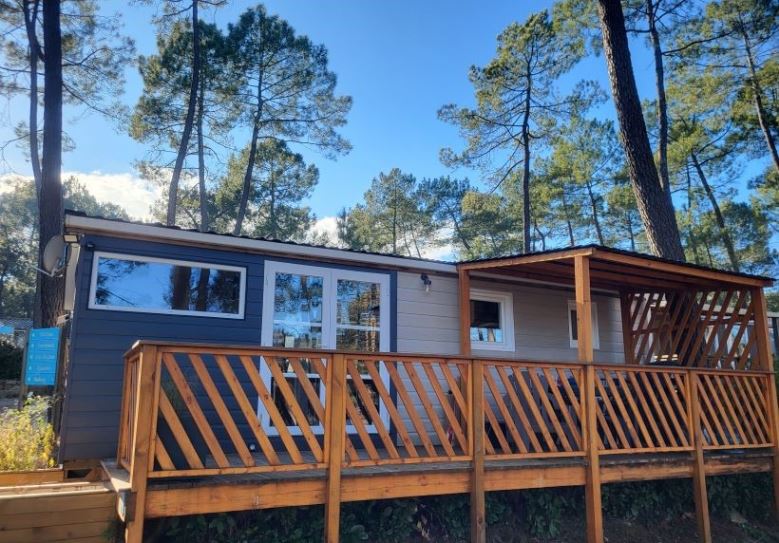 Mobil-home ROMARIN 50m2 avec terrasse semi-couverte. Parking devant le mobil-home.
